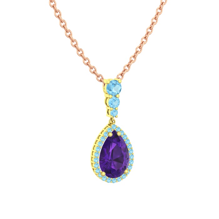 Ametist ve akuamarin 925 ayar altın kaplama gümüş kolye (40 cm rose altın rolo zincir)