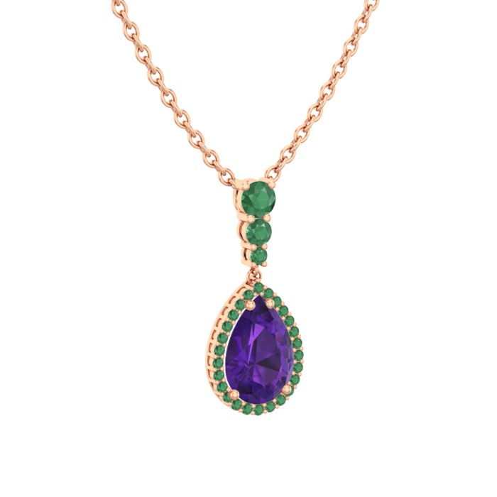 Ametist ve kök zümrüt 18 ayar rose altın kolye (40 cm rose altın rolo zincir)