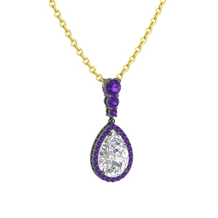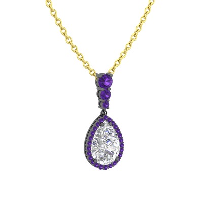 Beyaz zirkon ve ametist 925 ayar siyah rodyum kaplama gümüş kolye (40 cm gümüş rolo zincir)