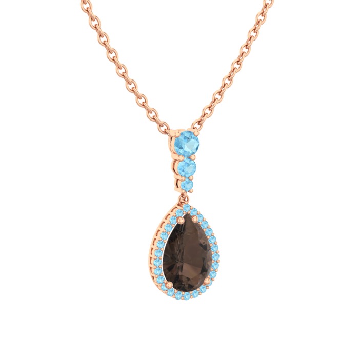 Dumanlı kuvars ve akuamarin 8 ayar rose altın kolye (40 cm gümüş rolo zincir)