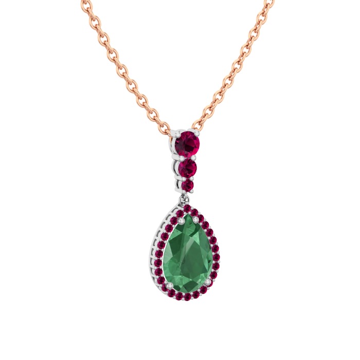 Kök zümrüt ve rodolit garnet 18 ayar beyaz altın kolye (40 cm rose altın rolo zincir)