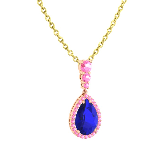 Lab safir ve pembe kuvars 925 ayar rose altın kaplama gümüş kolye (40 cm altın rolo zincir)