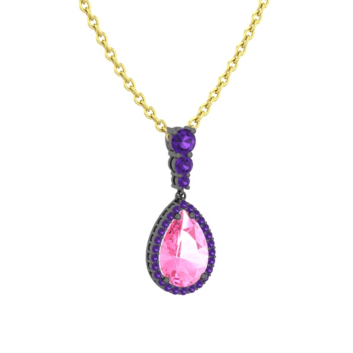 Pembe kuvars ve ametist 925 ayar siyah rodyum kaplama gümüş kolye (40 cm altın rolo zincir)