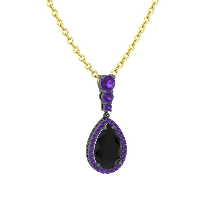 Siyah zirkon ve ametist 925 ayar siyah rodyum kaplama gümüş kolye (40 cm altın rolo zincir)
