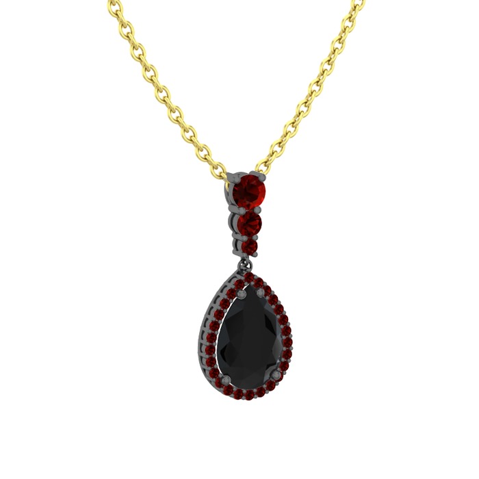 Siyah zirkon ve garnet 925 ayar siyah rodyum kaplama gümüş kolye (40 cm altın rolo zincir)