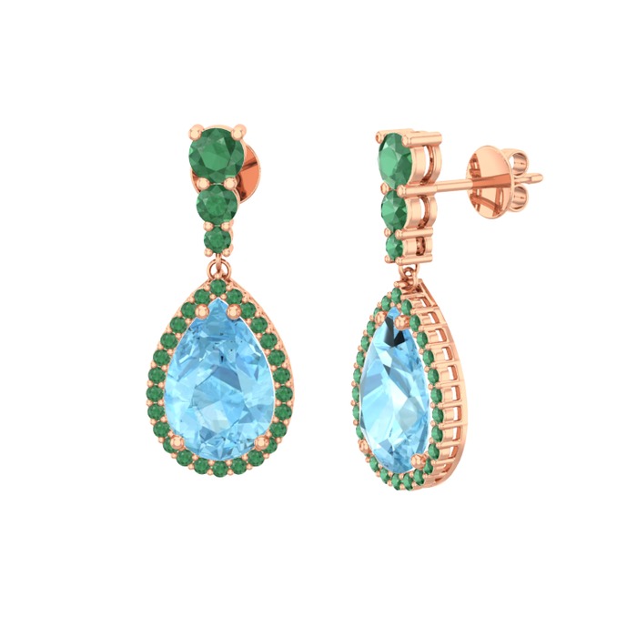 Akuamarin ve kök zümrüt 14 ayar rose altın küpe