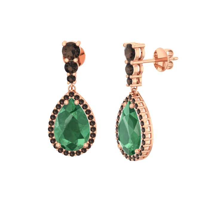 Kök zümrüt ve dumanlı kuvars 14 ayar rose altın küpe