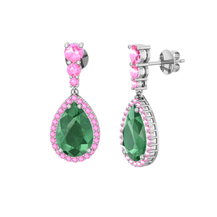 Kök zümrüt ve pembe kuvars 8 ayar beyaz altın küpe