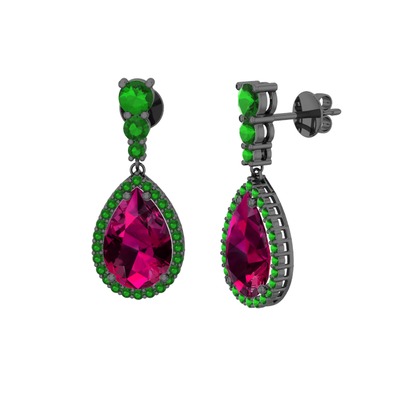 Rodolit garnet ve yeşil kuvars 925 ayar siyah rodyum kaplama gümüş küpe