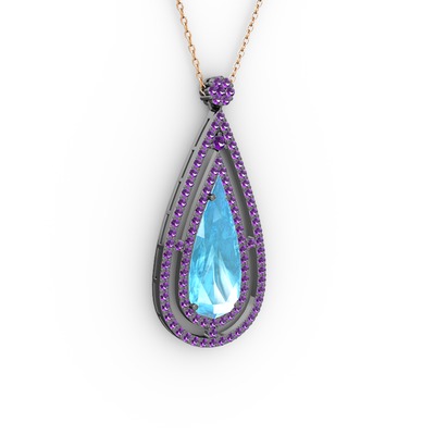 Akuamarin ve ametist 925 ayar siyah rodyum kaplama gümüş kolye (40 cm rose altın rolo zincir)