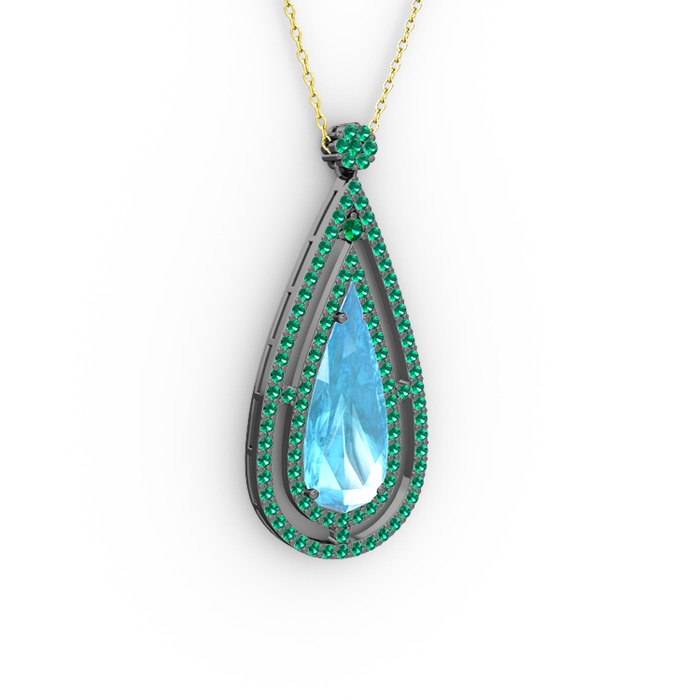Akuamarin ve yeşil kuvars 925 ayar siyah rodyum kaplama gümüş kolye (40 cm altın rolo zincir)