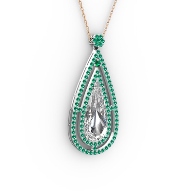 Beyaz zirkon ve yeşil kuvars 18 ayar beyaz altın kolye (40 cm rose altın rolo zincir)
