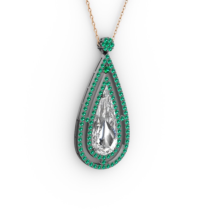 Beyaz zirkon ve yeşil kuvars 925 ayar siyah rodyum kaplama gümüş kolye (40 cm rose altın rolo zincir)
