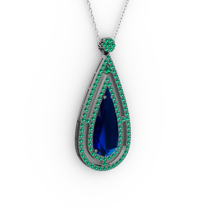 Lab safir ve yeşil kuvars 925 ayar siyah rodyum kaplama gümüş kolye (40 cm beyaz altın rolo zincir)