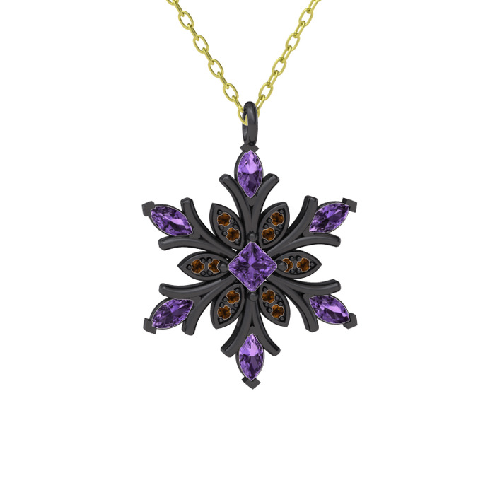 Ametist ve dumanlı kuvars 925 ayar siyah rodyum kaplama gümüş kolye (40 cm altın rolo zincir)