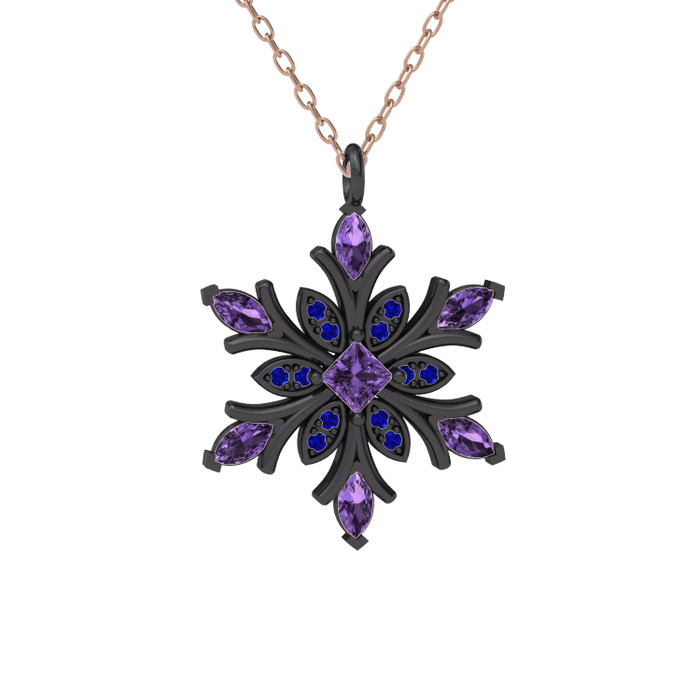 Ametist ve lab safir 925 ayar siyah rodyum kaplama gümüş kolye (40 cm rose altın rolo zincir)