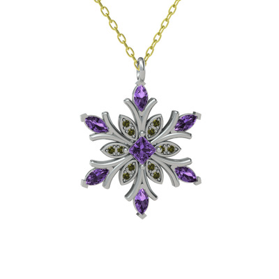 Ametist ve peridot 14 ayar beyaz altın kolye (40 cm altın rolo zincir)