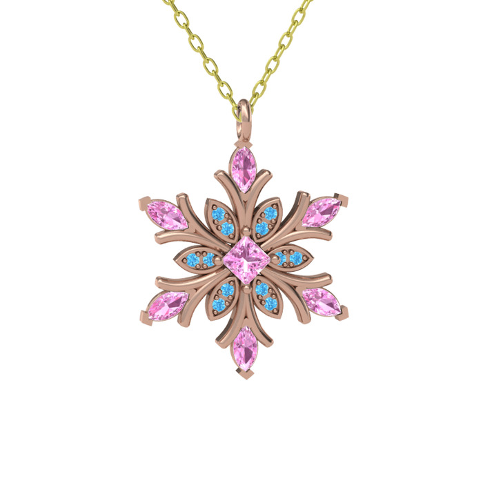 Pembe kuvars ve akuamarin 8 ayar rose altın kolye (40 cm gümüş rolo zincir)