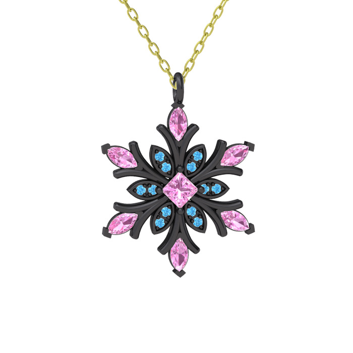 Pembe kuvars ve akuamarin 925 ayar siyah rodyum kaplama gümüş kolye (40 cm altın rolo zincir)