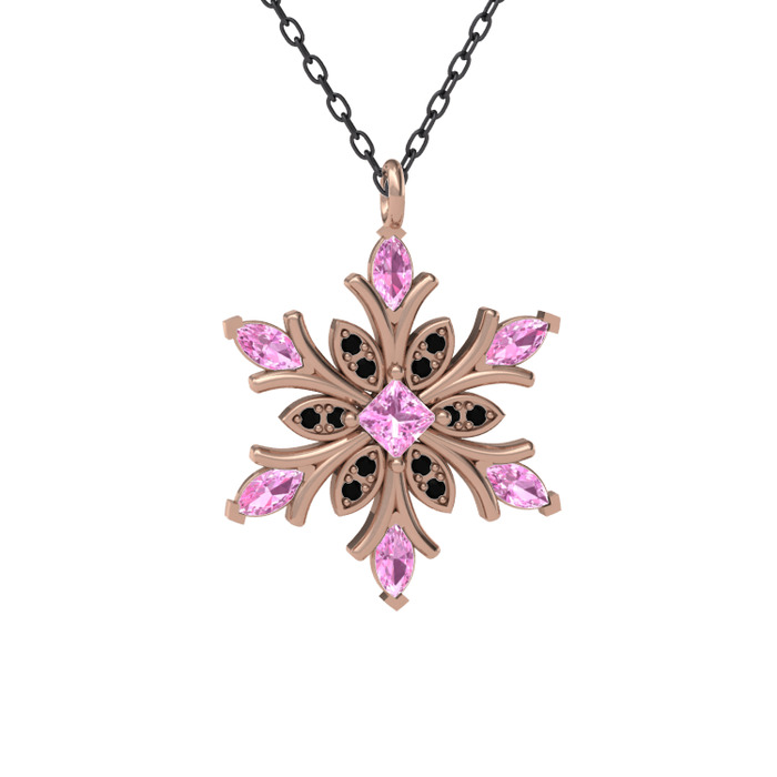 Pembe kuvars ve siyah zirkon 8 ayar rose altın kolye (40 cm gümüş rolo zincir)