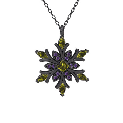 Peridot ve ametist 925 ayar siyah rodyum kaplama gümüş kolye (40 cm gümüş rolo zincir)