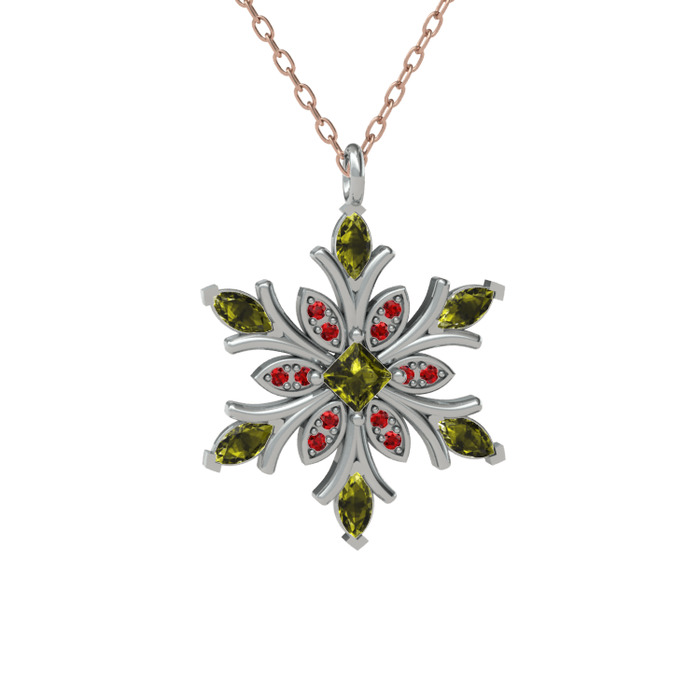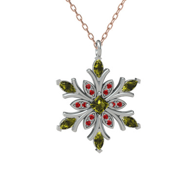 Peridot ve garnet 18 ayar beyaz altın kolye (40 cm rose altın rolo zincir)
