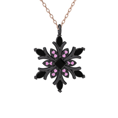 Siyah zirkon ve pembe kuvars 925 ayar siyah rodyum kaplama gümüş kolye (40 cm rose altın rolo zincir)