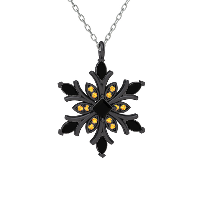 Siyah zirkon ve sitrin 925 ayar siyah rodyum kaplama gümüş kolye (40 cm beyaz altın rolo zincir)