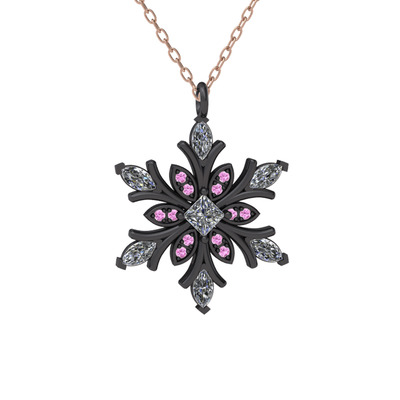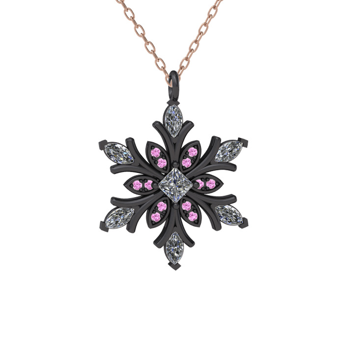 Swarovski ve pembe kuvars 925 ayar siyah rodyum kaplama gümüş kolye (40 cm rose altın rolo zincir)