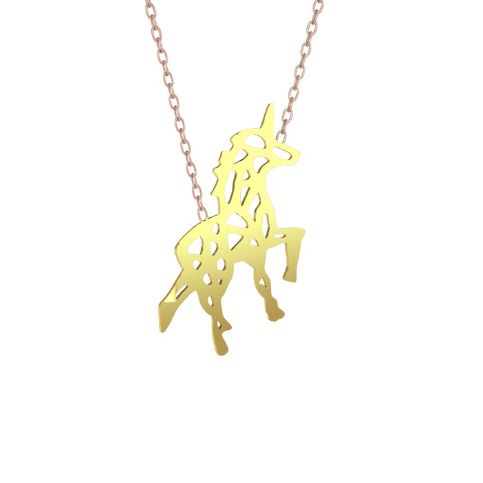 Origami Unicorn Kolye - 8 ayar altın kolye (40 cm rose altın rolo zincir)