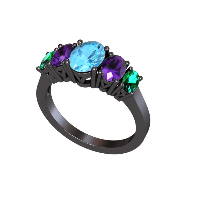 Akuamarin, ametist ve yeşil kuvars 925 ayar siyah rodyum kaplama gümüş yüzük