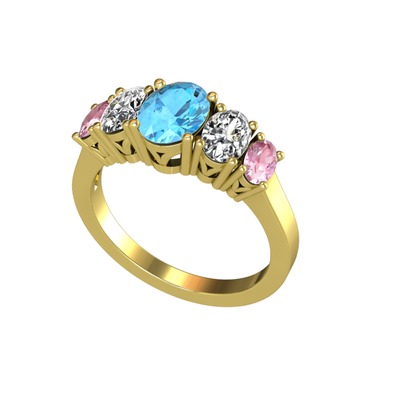 Akuamarin, beyaz zirkon ve pembe kuvars 8 ayar altın yüzük