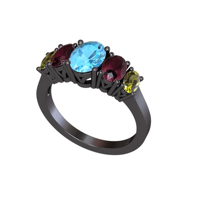 Akuamarin, kök yakut ve peridot 925 ayar siyah rodyum kaplama gümüş yüzük