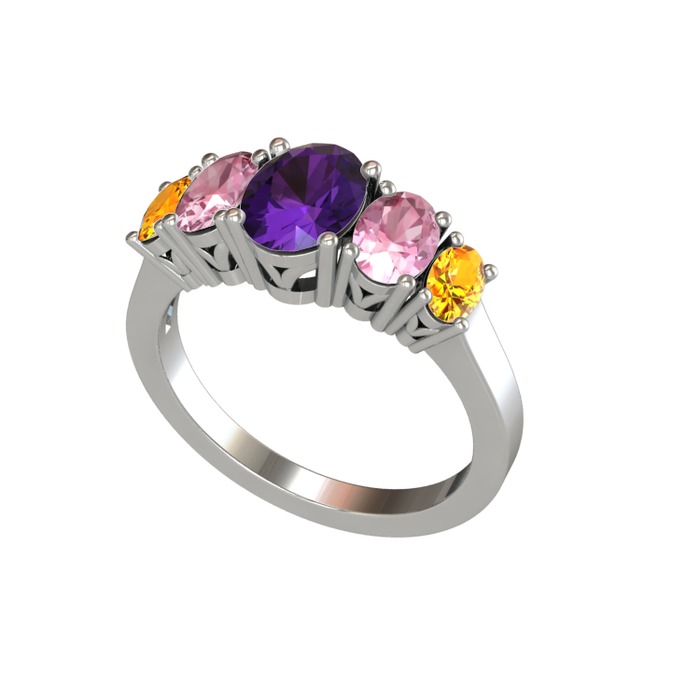 Ametist, pembe kuvars ve sitrin 8 ayar beyaz altın yüzük