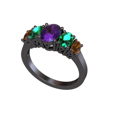 Ametist, yeşil kuvars ve dumanlı kuvars 925 ayar siyah rodyum kaplama gümüş yüzük