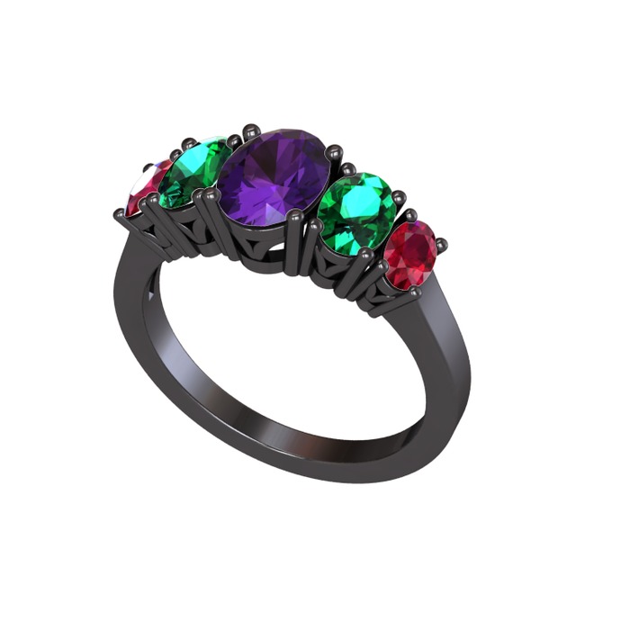 Ametist, yeşil kuvars ve rodolit garnet 925 ayar siyah rodyum kaplama gümüş yüzük