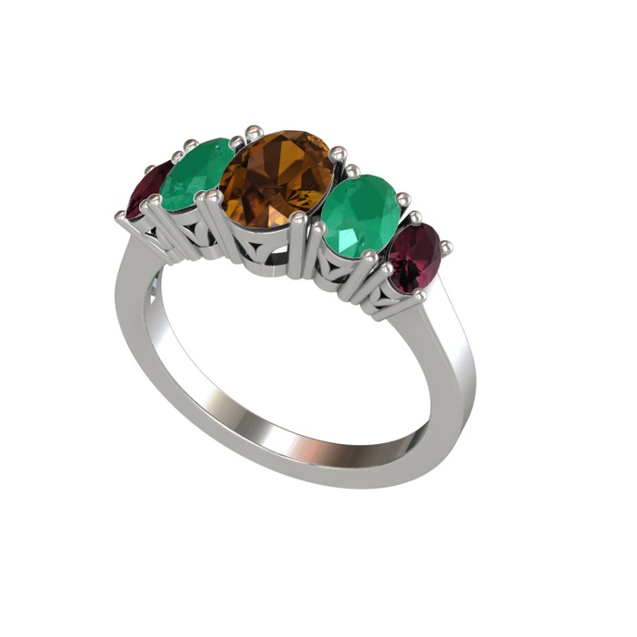 Dumanlı kuvars, kök zümrüt ve kök yakut 8 ayar beyaz altın yüzük