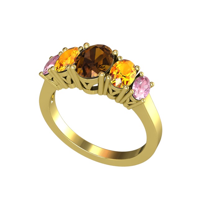 Dumanlı kuvars, sitrin ve pembe kuvars 925 ayar altın kaplama gümüş yüzük