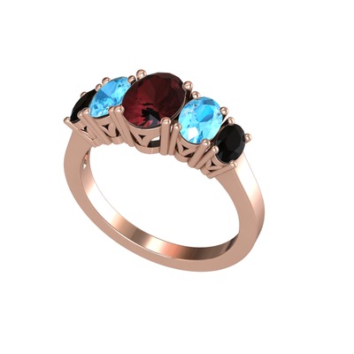 Kök yakut, akuamarin ve siyah zirkon 18 ayar rose altın yüzük