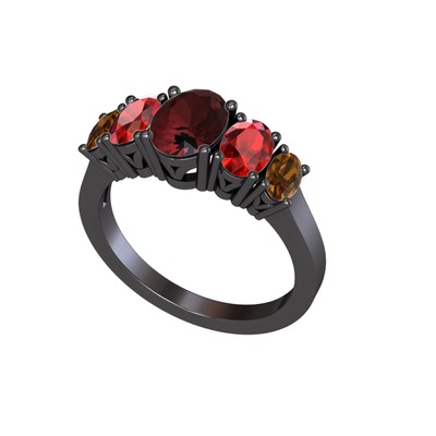 Kök yakut, garnet ve dumanlı kuvars 925 ayar siyah rodyum kaplama gümüş yüzük