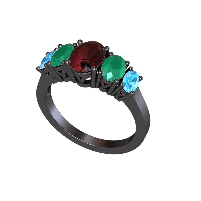 Kök yakut, kök zümrüt ve akuamarin 925 ayar siyah rodyum kaplama gümüş yüzük