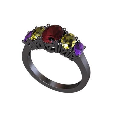 Kök yakut, peridot ve ametist 925 ayar siyah rodyum kaplama gümüş yüzük