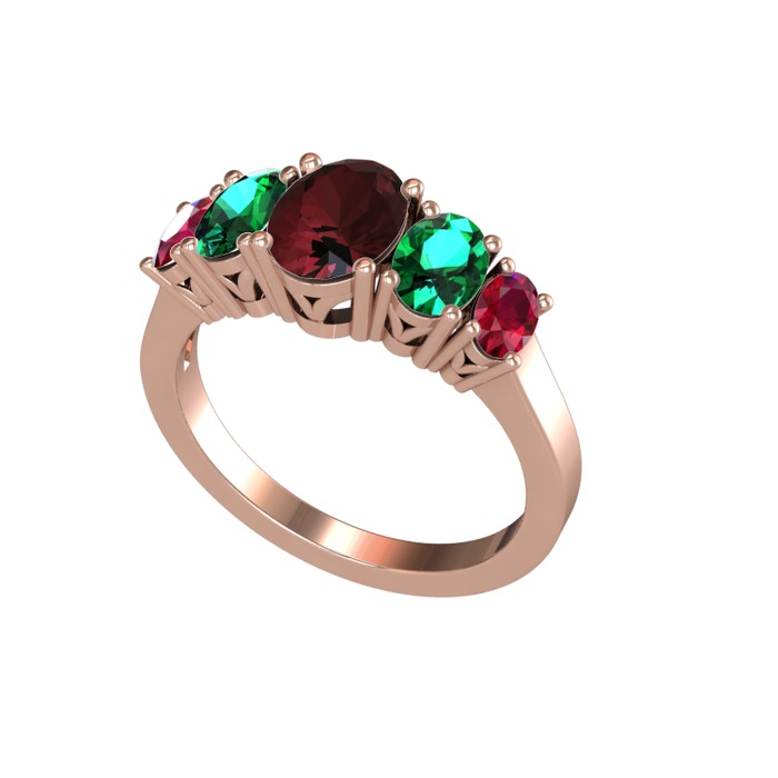 Kök yakut, yeşil kuvars ve rodolit garnet 925 ayar rose altın kaplama gümüş yüzük