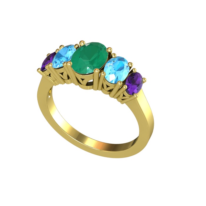 Kök zümrüt, akuamarin ve ametist 14 ayar altın yüzük