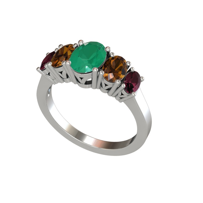Kök zümrüt, dumanlı kuvars ve kök yakut 18 ayar beyaz altın yüzük