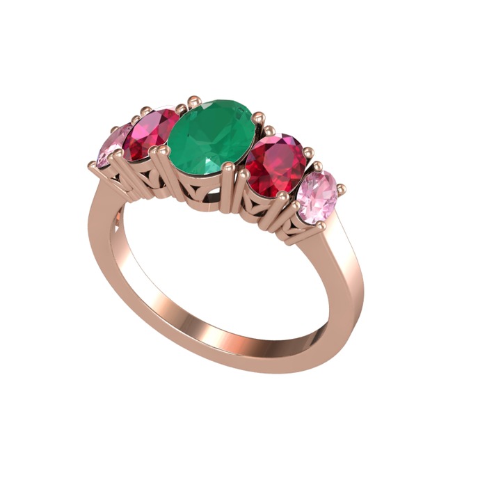 Kök zümrüt, rodolit garnet ve pembe kuvars 925 ayar rose altın kaplama gümüş yüzük