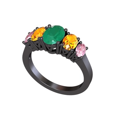 Kök zümrüt, sitrin ve pembe kuvars 925 ayar siyah rodyum kaplama gümüş yüzük