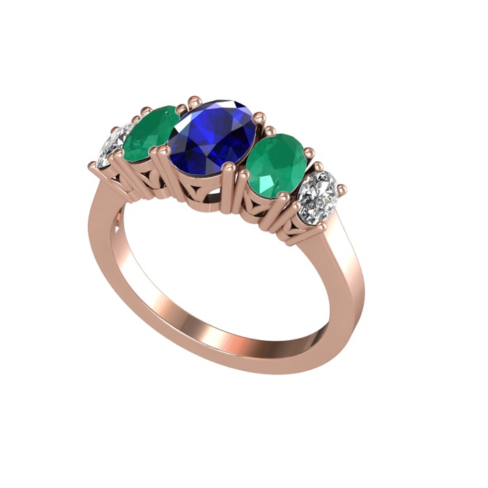 Lab safir, kök zümrüt ve beyaz zirkon 8 ayar rose altın yüzük