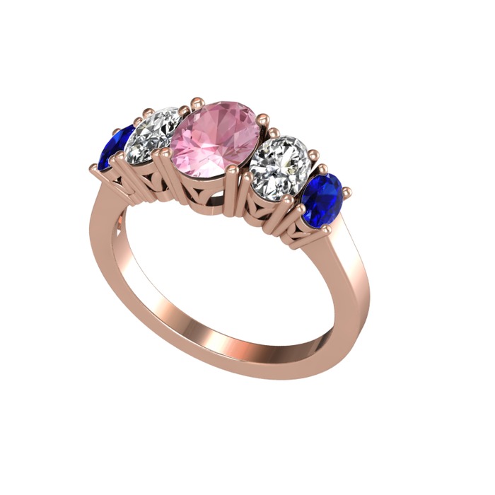 Pembe kuvars, beyaz zirkon ve lab safir 14 ayar rose altın yüzük