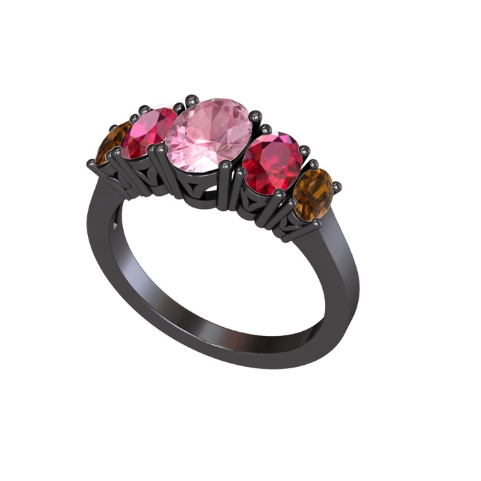 Pembe kuvars, rodolit garnet ve dumanlı kuvars 925 ayar siyah rodyum kaplama gümüş yüzük